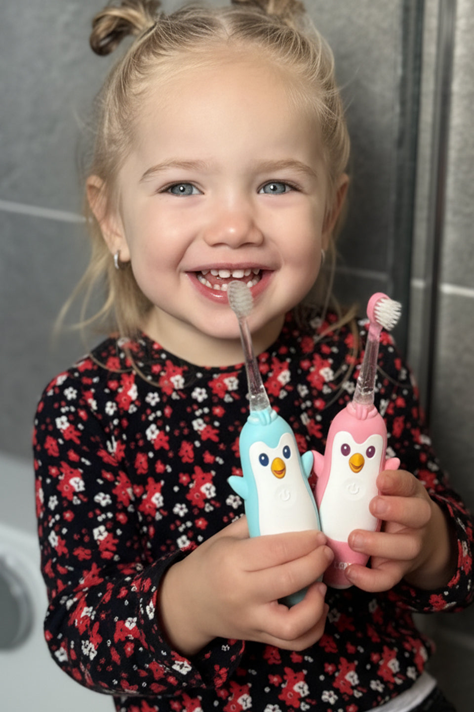 Onze peuter wilde nooit poetsen. Maar met die penguinborstel is het ineens een soort spelletje. Ze staat nu zelf al klaar bij de wastafel.